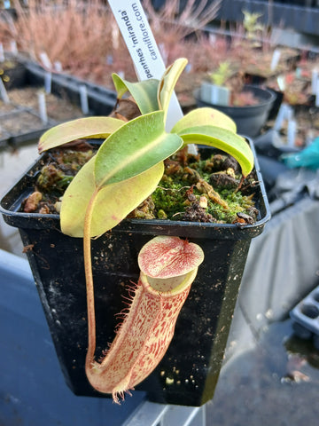 Cultivar officiel, le Nepenthes 'Miranda' est issu d'un croisement inconnu, dont seule la présence de N. maxima dans sa génetique est avéré. Plante vigoureuse qui produit de très grands pièges allongés et tachetés de rouge, il convient parfaitement au débutant comme au collectionneur.