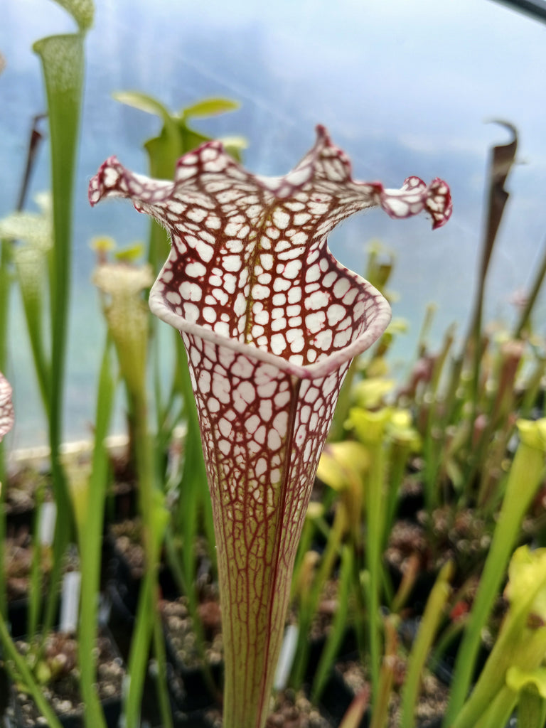 Cultivar officiel, le Sarracenia 'Cronus' Titan tm est issu du croisement de 2 populations de Sarracenia leucophylla, de régions différentes. Plante à croissance rapide, il produit de grands pièges. Chapeau assez court, il est orné d'un veinage fin. Ses nouvelles feuilles arborent une jolie couleur rouge qui devient verte en vieillissant. Peristome blanc.