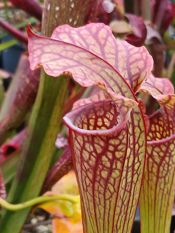 Cultivar officiel, ce Sarracenia hybride est issu du croisement ( S. leucophylla x (S. leucophylla x (S flava maxima x S. purpurea)). Enregistré en 1998, il a été crée par A. Slack. Feuilles vertes, présentant un chapeau légerement cuivré veiné de rouge. En automne, une repousse nous offre des pièges coloration differente, plus cuivré. Encore assez rare en culture. Plante provenant de la collection d'A. Slack de la pépiniere PJ plants.